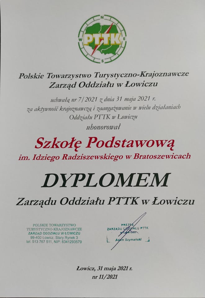 W dniu zakończenia roku szkolnego 2020/2021 przedstawiciel zarządu łowickiego Oddziału Polskiego Towarzystwa Turystyczno – Krajoznawczego w Łowiczu Pan Zdzisław Kryściak złożył na ręce Pani Dyrektor Ewy Piórkowskiej Dyplom Zarządu Oddziału PTTK w Łowiczu za aktywność krajoznawczą i zaangażowanie w wielu działaniach Oddziału PTTK w Łowiczu. Wręczenie dyplomu miało miejsce w czasie akademii zakończenia roku szkolnego. Szkoła otrzymała również 2 pozycje książkowe o regionie łowickim, które wzbogacą księgozbiór biblioteki szkolnej. Byliśmy bardzo zaskoczeni uhonorowaniem naszej placówki. Serdecznie dziękujemy!!! Do zobaczenia na turystycznym szlaku!!! Nasza placówka już od 2009 roku uczestniczy w wielu imprezach turystycznych: rowerowych, kajakowych i pieszych organizowanych przez łowicki jak i łódzki odział PTTK. Od dwóch lat przy naszej szkole funkcjonuje Szkolne Koło Krajoznawczo – Turystyczne, którego opiekunem jest Pani Elżbieta Foks. Inicjatorami założenia koła byli rodzice naszych uczniów. Tekst: E. Foks Zdjęcia: A. Miller i E. Foks