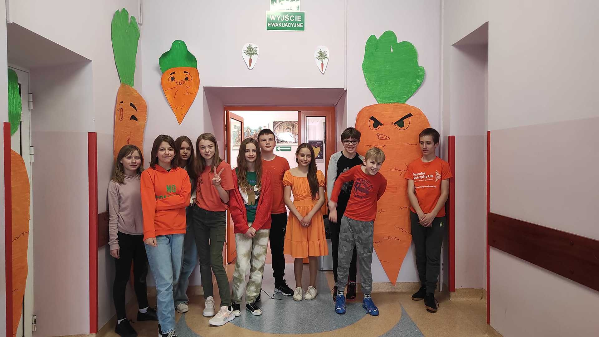 W szkolnych obchodach Dnia Marchewki uczestniczyli uczniowie z klas IV - VIII. Czwartoklasiści od samego rana wraz z wychowawczynią przystąpili do pieczenia ciasta marchewkowego, które okazało się wyśmienite. Uczniowie z klasy piątej założyli ubrania w kolorze marchewkowym oraz wysłuchali mini wykładu o wartościach odżywczych marchewki. Szóstoklasiści przygotowali marchewkową dekorację górnego korytarza oraz chętnie chrupali świeżą marchewkę. W siódmej klasie obył się poczęstunek ciasta marchewkowego, prezentacja plakatu z treściami dotyczącymi wartości zdrowotnych marchwi oraz prezentacje prac plastycznych przedstawiające marchew. Chłopcy z siódmej klasy przygotowali również modele marchewki z surowców wtórnych. Dziewczęta z ósmej klasy zorganizowały poczęstunek ciasta oraz babeczek marchewkowych - wypieki były bardzo smaczne!!! Dzień 4 kwietnia był bardzo kolorowym i radosnym dniem w naszej szkole!!!