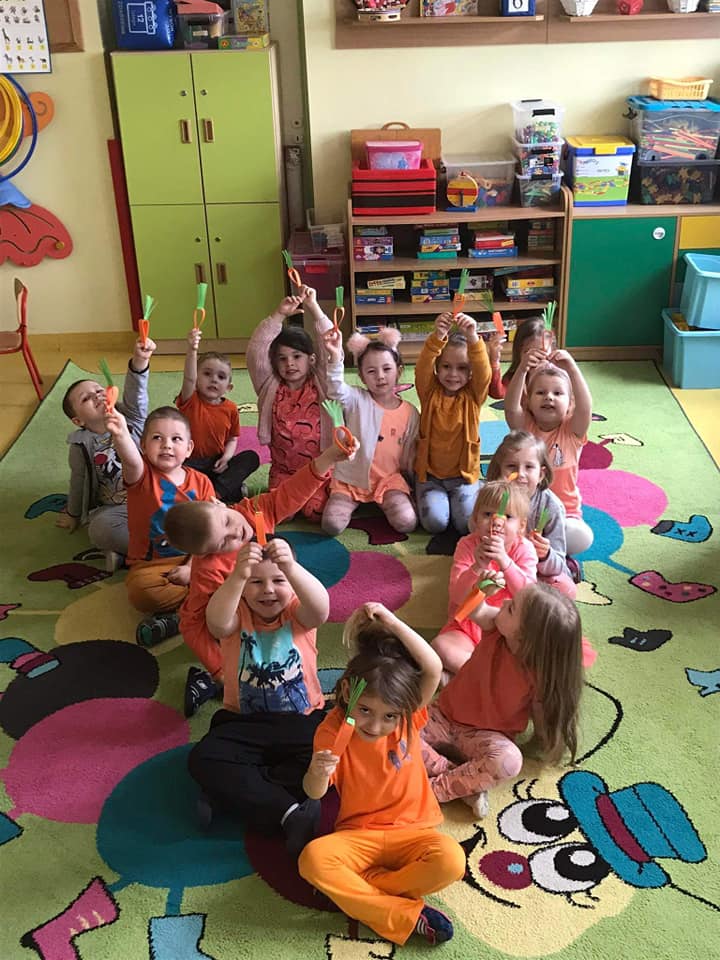 Dzień Marchewki w zerówce był dniem pierwszych wyzwań kulinarnych. Dzieci najpierw poznały wartości odżywcze marchewki oraz dowiedziały sie co zawiera to warzywo oraz co można z niego zrobić. Następnie samodzielnie tarły marchewki na surówkę co pozwoliło im poznać strukturę i smak tego warzywa, a także zaobserwować zjawisko barwienia przez marchewkę spowodowane karotenem. Ucieranie marchewki okazało się zadaniem niełatwym ale satysfakcjonującym. Dzieci ze smakiem zjadły swoje surówki i doskonale bawiły się tego dnia. W oddziale "0B" również tego dnia królowała marchewka, a kolorem dominującym zarówno wśród dzieci jak i nauczycieli był kolor pomarańczowy. Wszystkie przedszkolaki brały udział w zabawach dotyczących wyglądu i wartości odżywczych marchewki. Z wielką starannością dzieci uczestniczyły w zajęciach plastycznych, dzięki ich zaangażowaniu powstały marchewki do złudzenia przypominające prawdziwe warzywa. Atrakcją oraz wyzwaniem okazało się przygotowanie soku oraz surówki z marchewki. Na zakończenie dzieci uczestniczyły w grach interaktywnych. Dzień pełen wrażeń, wesołej zabawy i okazji do wzbogacania wiedzy o zdrowym odżywianiu