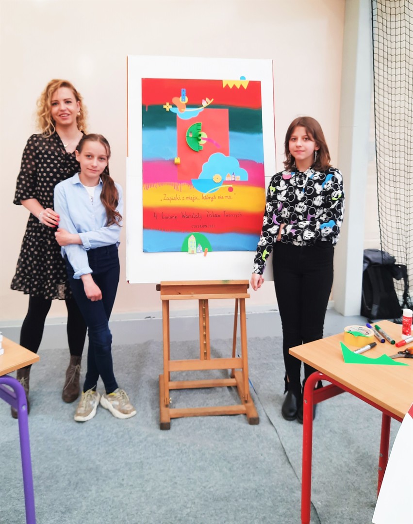 W dniu dzisiejszym (22.04) dwie uczennice z klasy 6 Dorota Owadzień oraz Michalina Śliwkiewicz wraz z nauczycielką plastyki p. Aleksandrą Miller udały się na warsztaty plastyczne organizowane w Szkole Podstawowej nr 1 w Strykowie. Tegoroczne 4 Gminne Warsztaty Zabaw Twórczych prowadzone przez artystów plastyków p. Krzysztofa Wosika i p. Tadeusza Wieczorka odbyły się pod hasłem: "Zapiski z miejsc, których nie ma..."