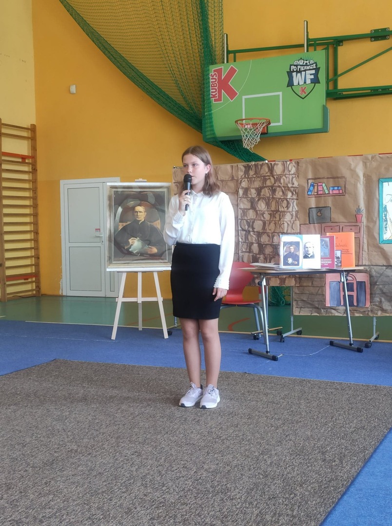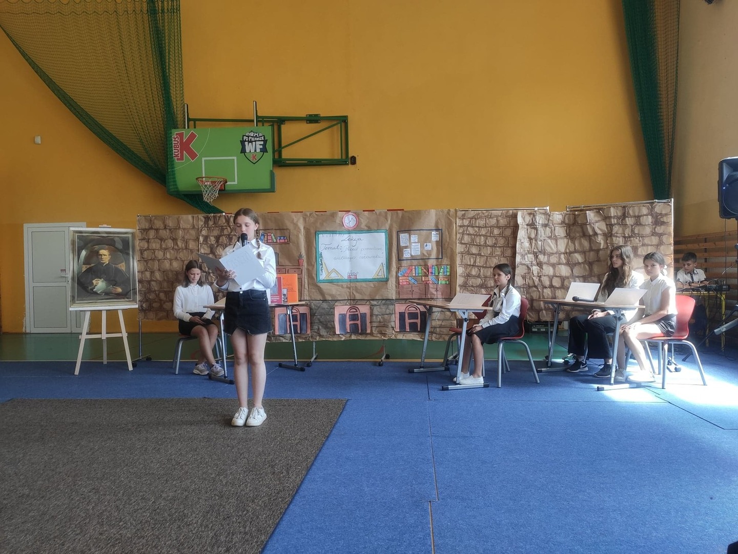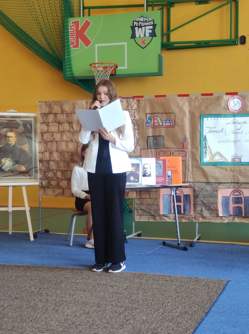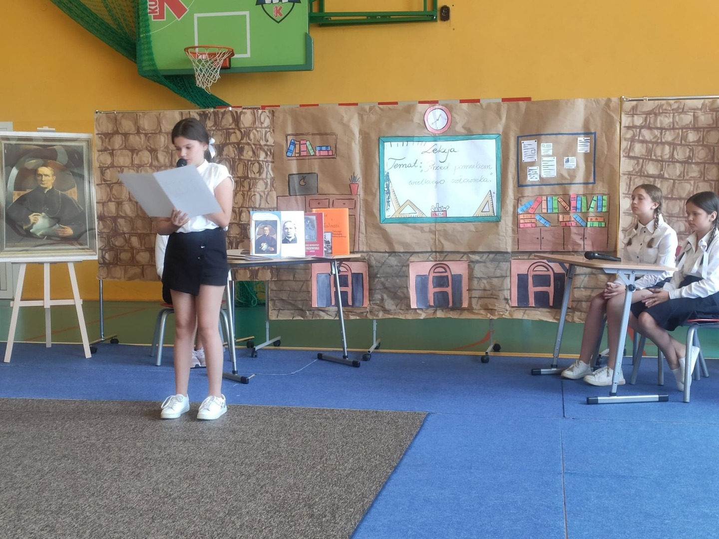 Uczniowie naszej szkoły zaś podzielili się z gośćmi swoim widzeniem postaci patrona szkoły. W krótkiej części artystycznej uczennice klasy siódmej oraz piątej zaprezentowały w formie lekcji „Przed pomnikiem wielkiego człowieka” twórczość naszych absolwentów dotyczącą osoby księdza Idziego Radziszewskiego – wiersze, listy, albumy oraz malunki.