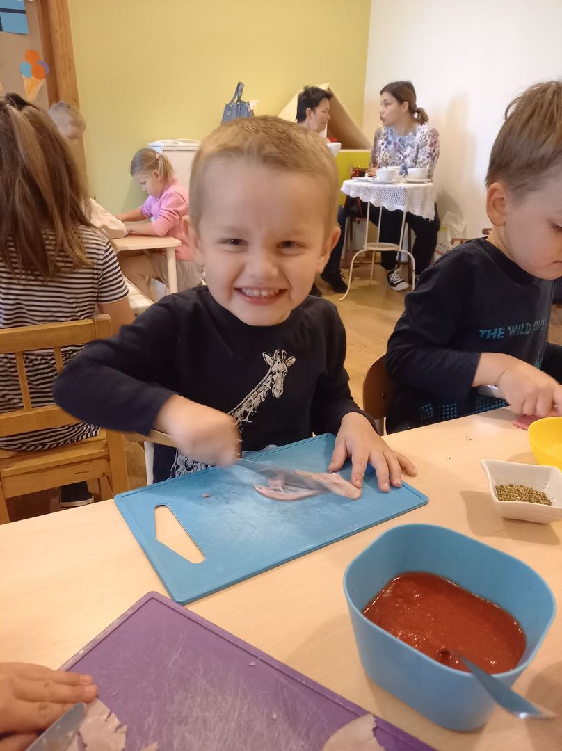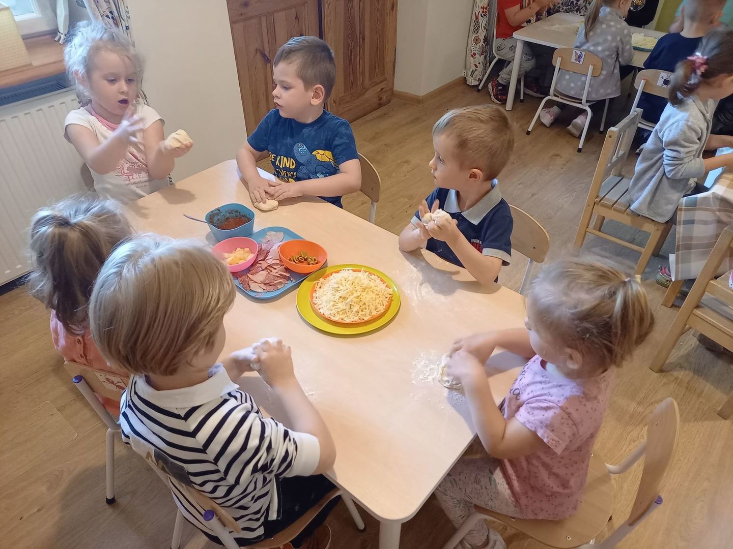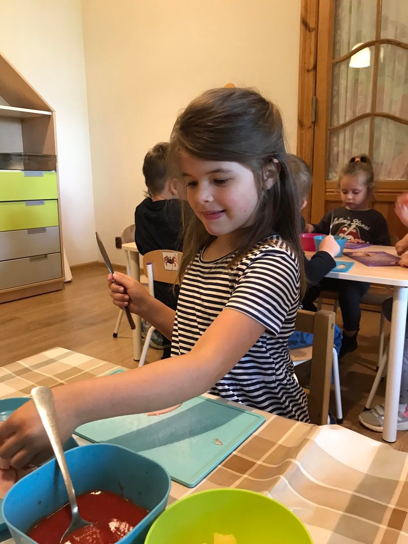 1 czerwca w Dzień Dziecka, przedszkolaki z grupy 0a i 0b wzięły udział w warsztatach robienia pizzy w Akademii Twórczego Rozwoju INSPIRO w Łodzi. Dzieci miały okazję dowiedzieć się skąd wywodzi się pizza i jak ją prawidłowo przygotowywać. Po pokazie przedszkolaki przystąpiły do samodzielnego przygotowania pizzy ze swoimi ulubionymi składnikami – wałkowały ciasto, smarowały sosem pomidorowym, układały ulubione produkty. Jak przystało na prawdziwych szefów kuchni z przygotowaniem pizzy dzieci poradziły sobie znakomicie. Zajęcia kulinarne to dla dzieci fascynująca podróż do świata smaków, zapachów i kolorów. Dzięki zabawie w gotowanie połączonej z elementami terapii sensorycznej w prosty i przyjemny sposób możemy wspierać dzieci w poznawaniu zmysłowym i rozumieniu przez nie otaczającego ich świata.