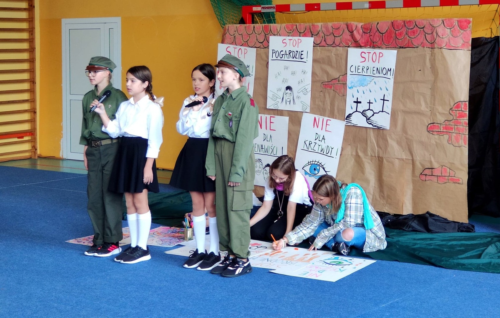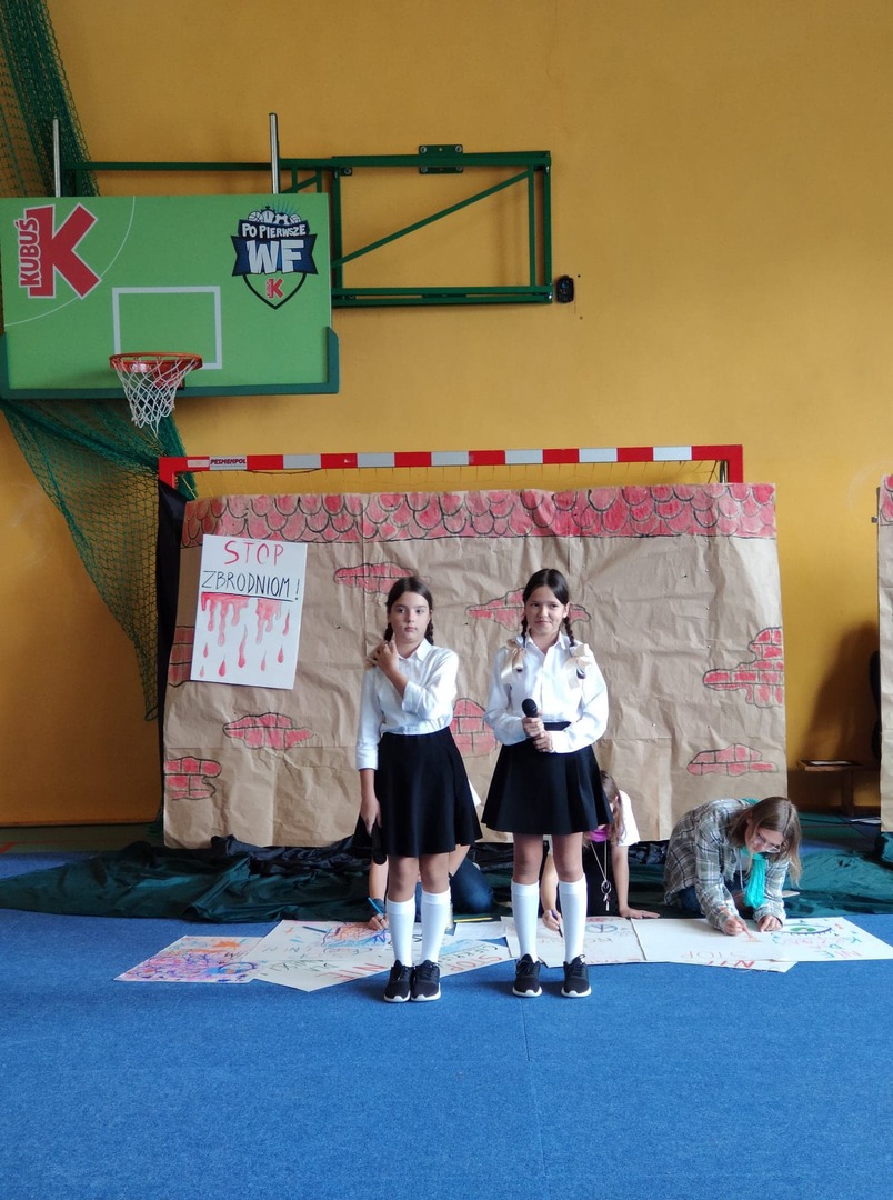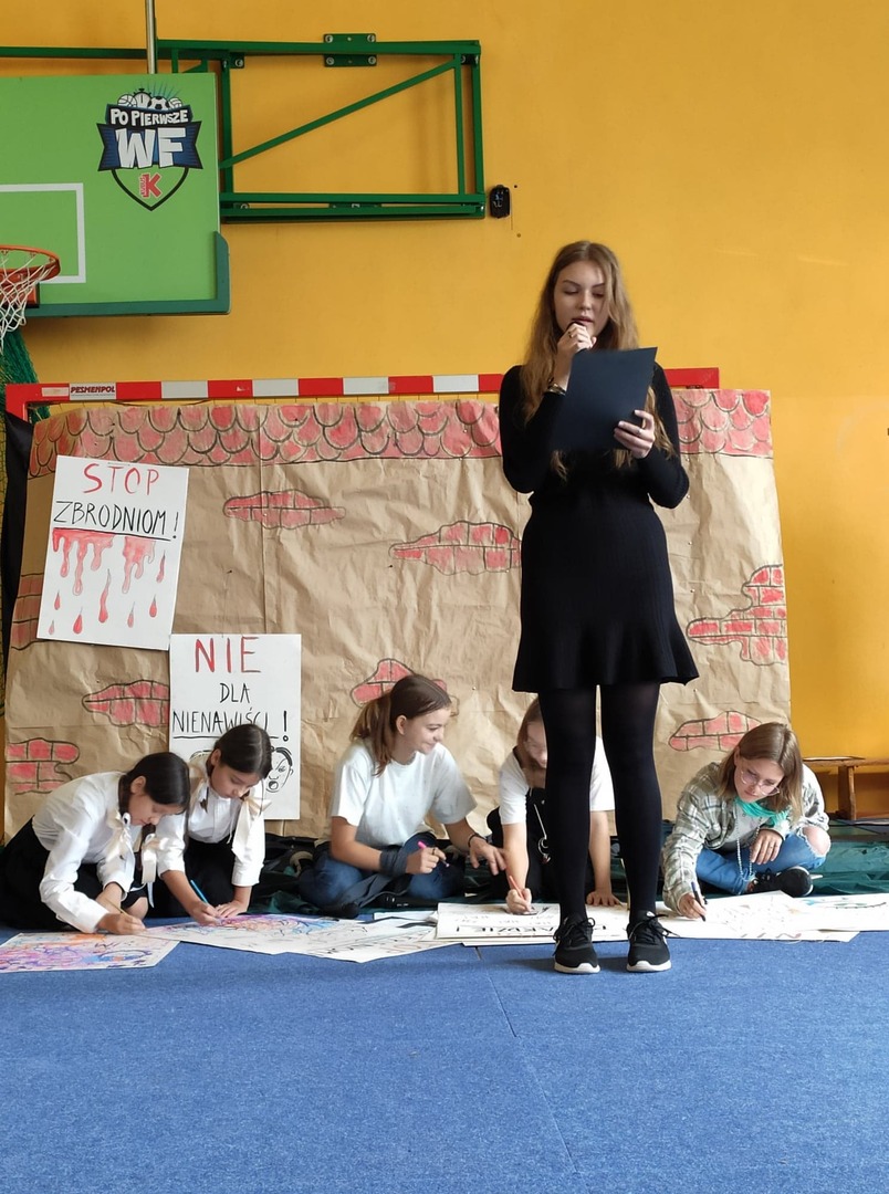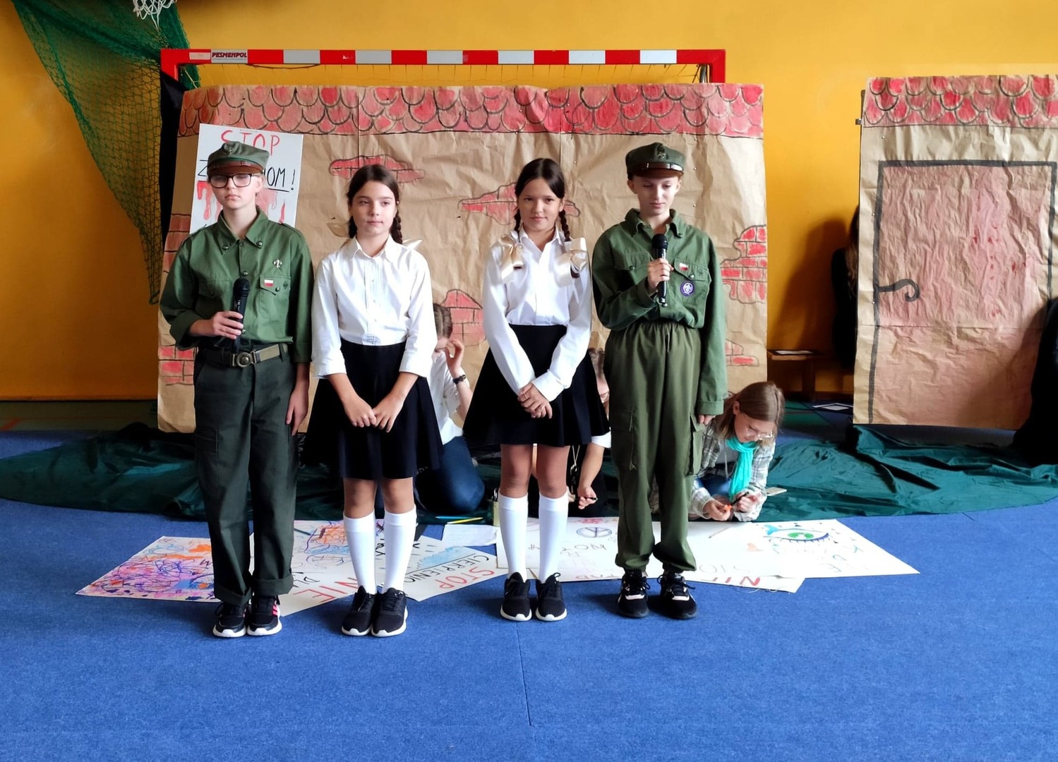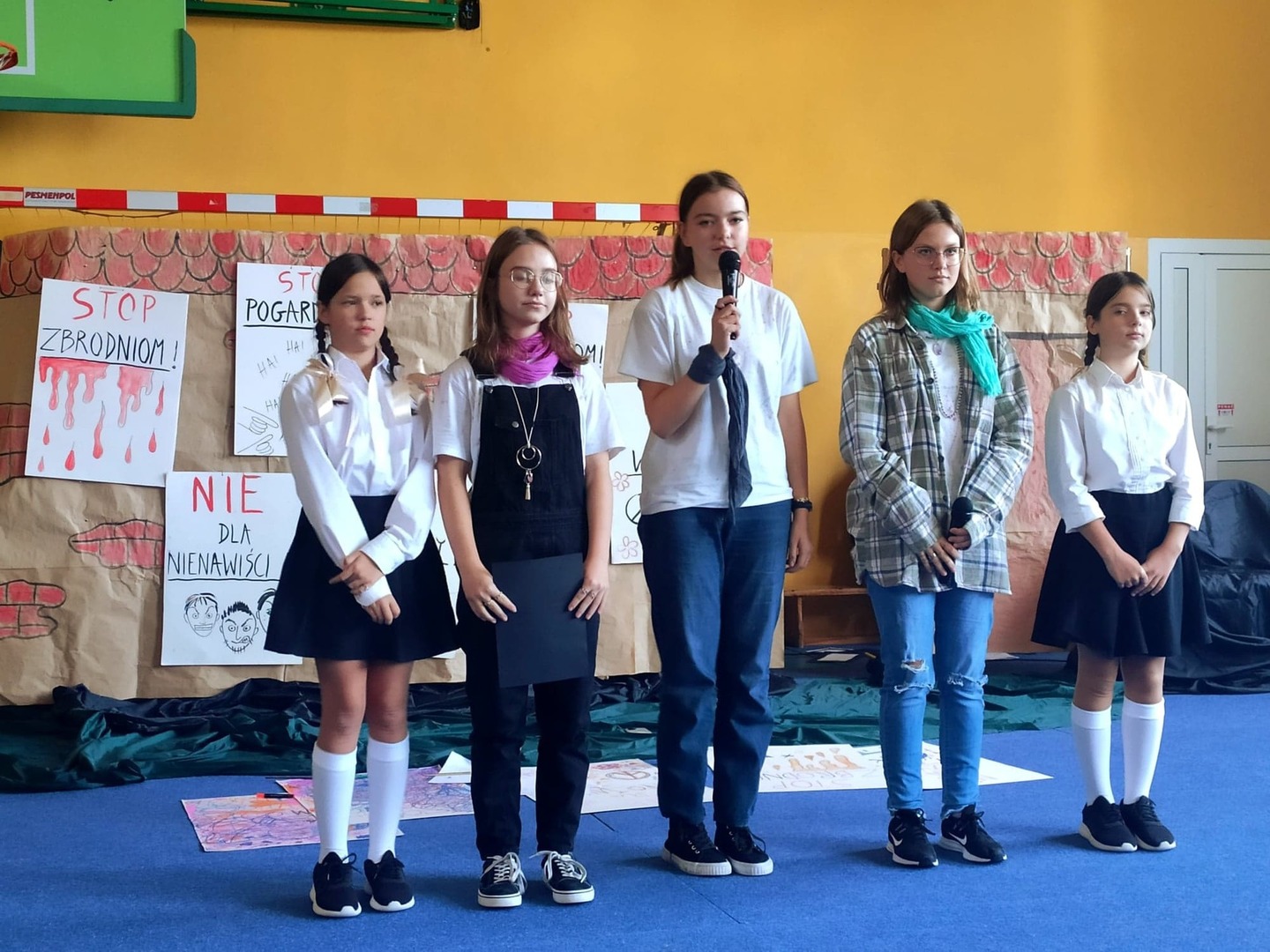 Po przemówieniu Pana Burmistrza młodzież naszej szkoły zaprezentowała krótką część artystyczną, której myśl przewodnia łączyła się z wystąpieniem pana profesora – że wojna i wszystko, co rodzi się z przemocy, pogardy, nienawiści, co wiąże się z krzywdą i cierpieniem drugiego człowieka jest złem, którego nic nie jest w stanie usprawiedliwić, złem, które nie powinno się wydarzać, złem, na które młode pokolenie się nie godzi. Poruszające serca pieśni zaśpiewały Milena Markowska, Oliwia Walak, Wiktoria Pokucińska, Zosia Antosiak, Gabrysia Antosiak, Oliwia Borkowska, Hania Chądzyńska i Martyna Jesiołowska , a pełne wyrazu wiersze Czesława Miłosza i Krzysztofa Kamila Baczyńskiego recytowała Aleksandra Binias. W przedstawieniu odegrali również role Janek Gocek i Krystian Szepke, a całość przygotowały panie Iwona Ciecińska i Dorota Pacewicz, zaś do wykonania oprawy plastycznej przyłączyła się pani Aleksandra Miller. Była to – jak co roku – niezapomniana i poruszająca lekcja historii.