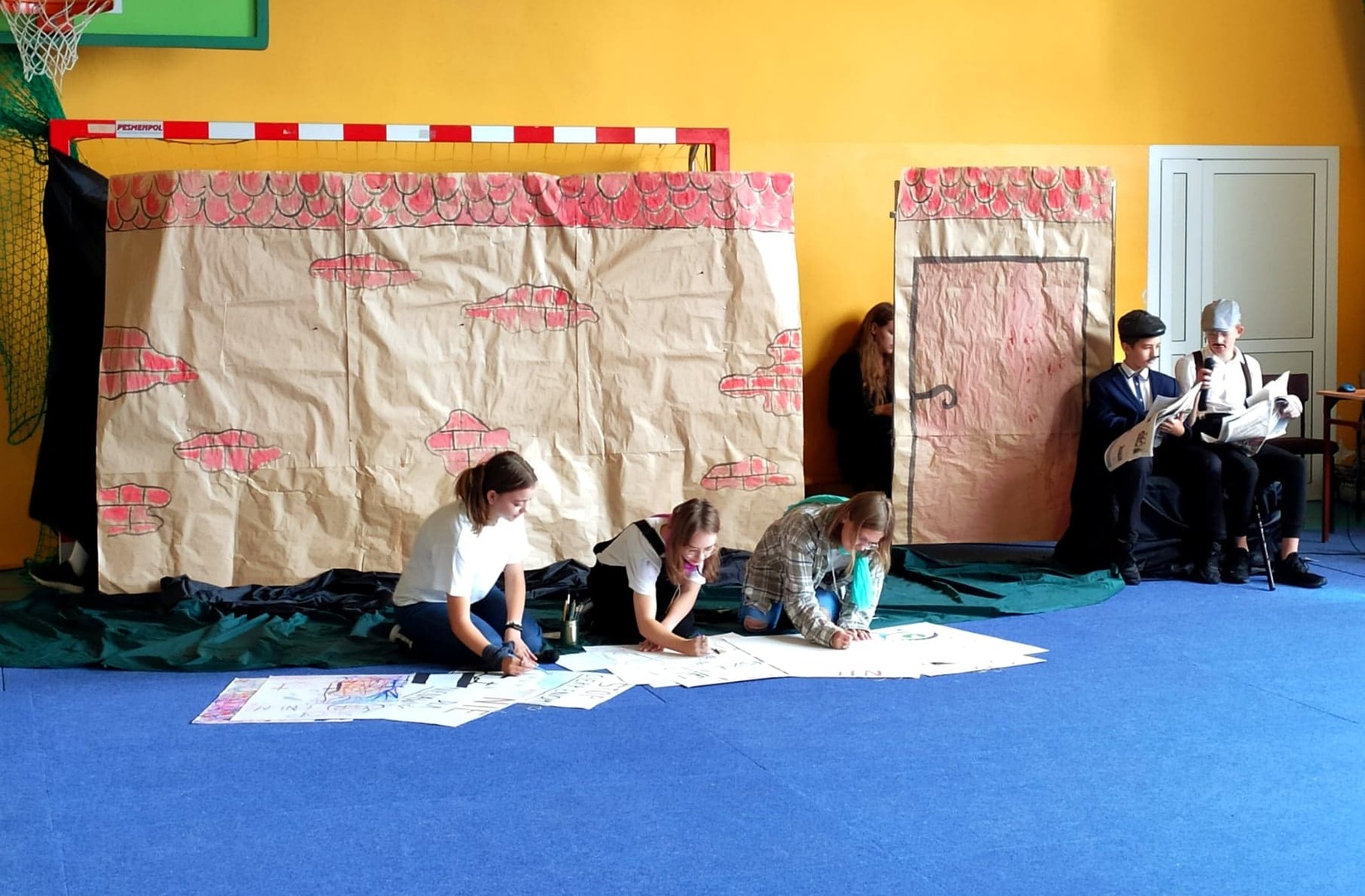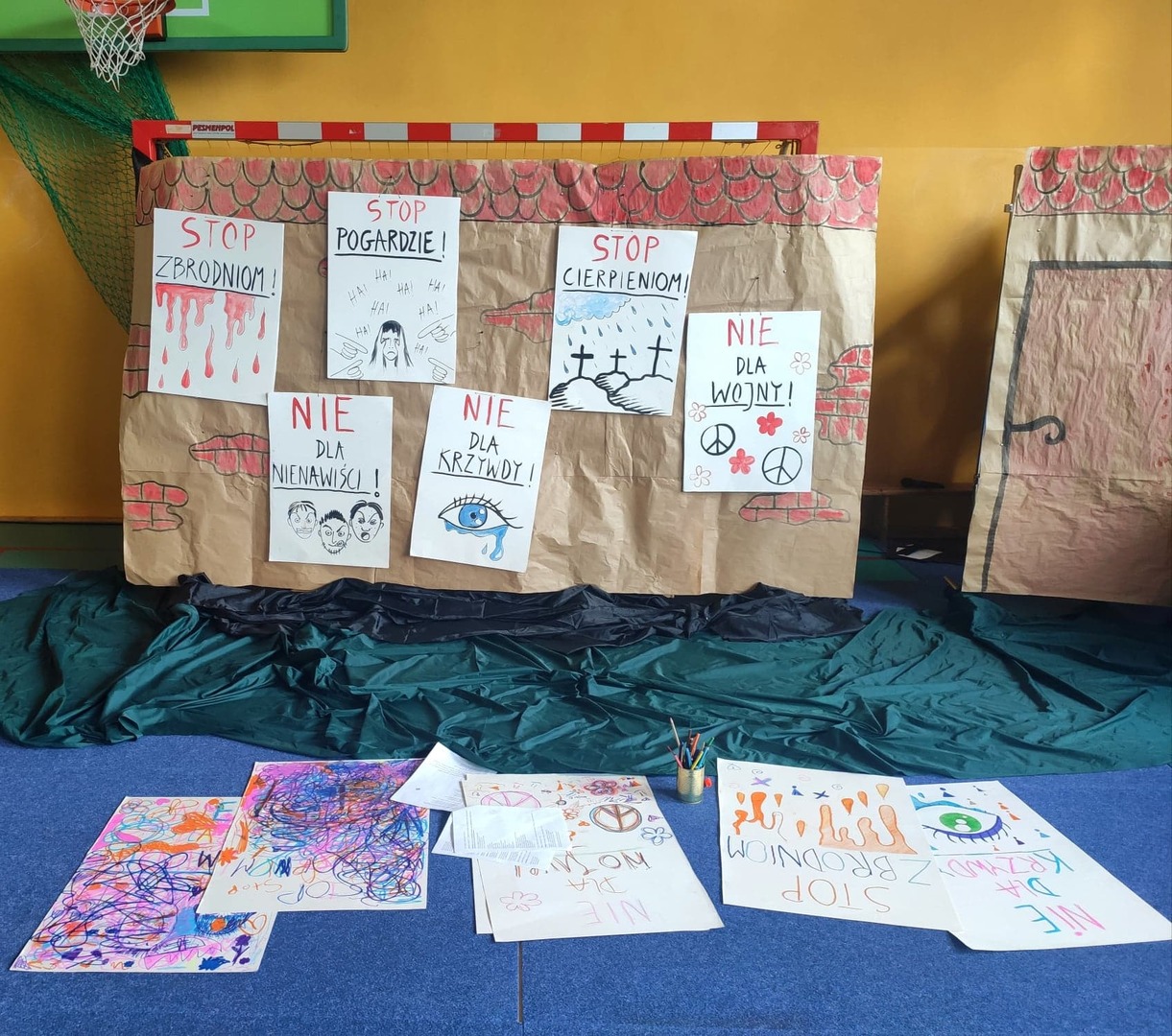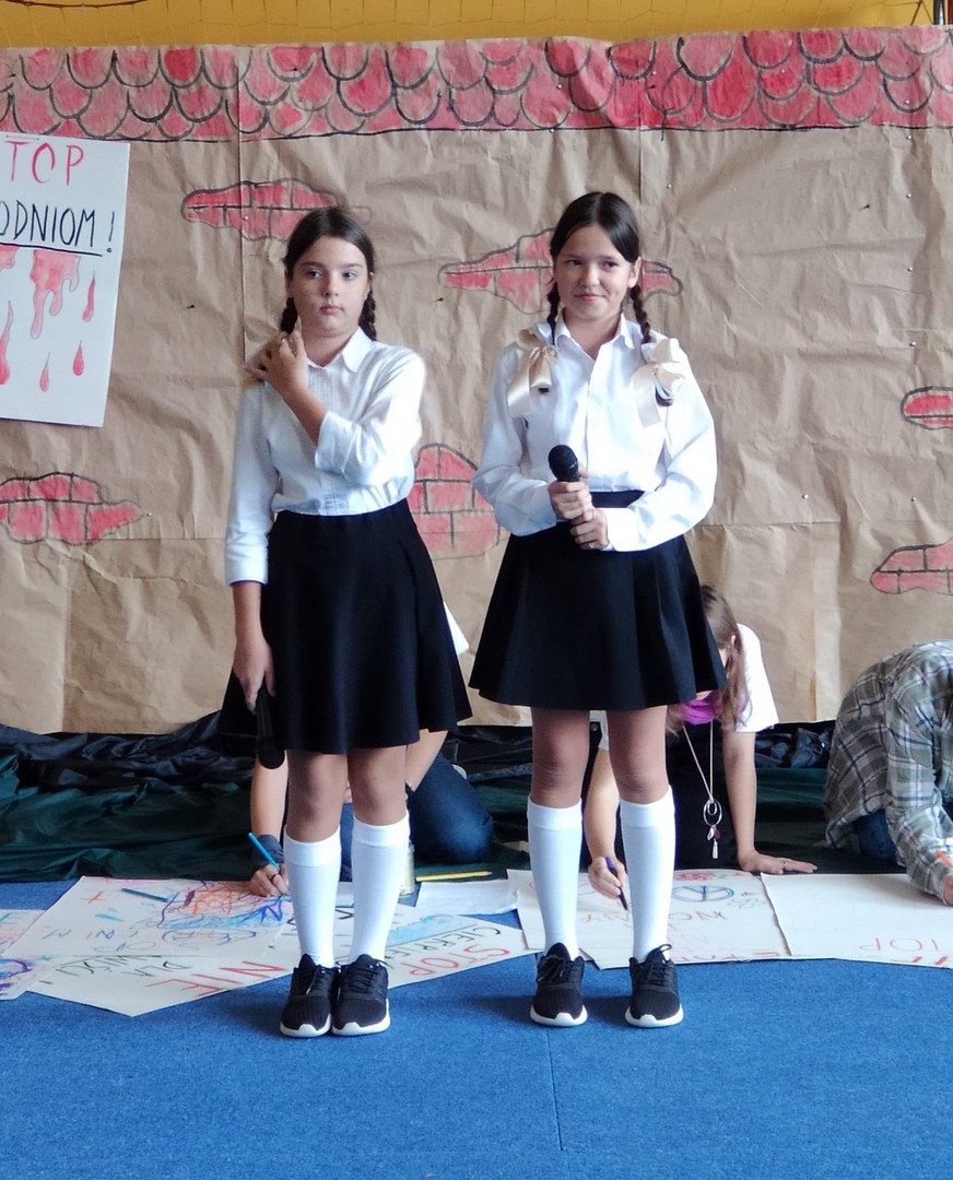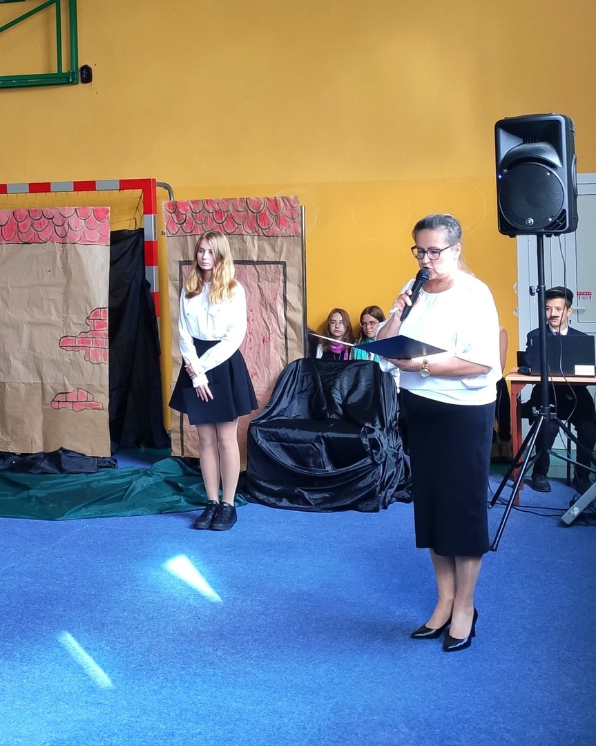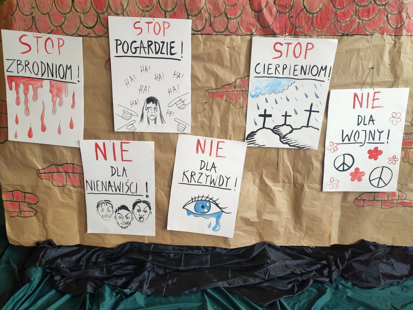 Po przemówieniu Pana Burmistrza młodzież naszej szkoły zaprezentowała krótką część artystyczną, której myśl przewodnia łączyła się z wystąpieniem pana profesora – że wojna i wszystko, co rodzi się z przemocy, pogardy, nienawiści, co wiąże się z krzywdą i cierpieniem drugiego człowieka jest złem, którego nic nie jest w stanie usprawiedliwić, złem, które nie powinno się wydarzać, złem, na które młode pokolenie się nie godzi. Poruszające serca pieśni zaśpiewały Milena Markowska, Oliwia Walak, Wiktoria Pokucińska, Zosia Antosiak, Gabrysia Antosiak, Oliwia Borkowska, Hania Chądzyńska i Martyna Jesiołowska , a pełne wyrazu wiersze Czesława Miłosza i Krzysztofa Kamila Baczyńskiego recytowała Aleksandra Binias. W przedstawieniu odegrali również role Janek Gocek i Krystian Szepke, a całość przygotowały panie Iwona Ciecińska i Dorota Pacewicz, zaś do wykonania oprawy plastycznej przyłączyła się pani Aleksandra Miller. Była to – jak co roku – niezapomniana i poruszająca lekcja historii.