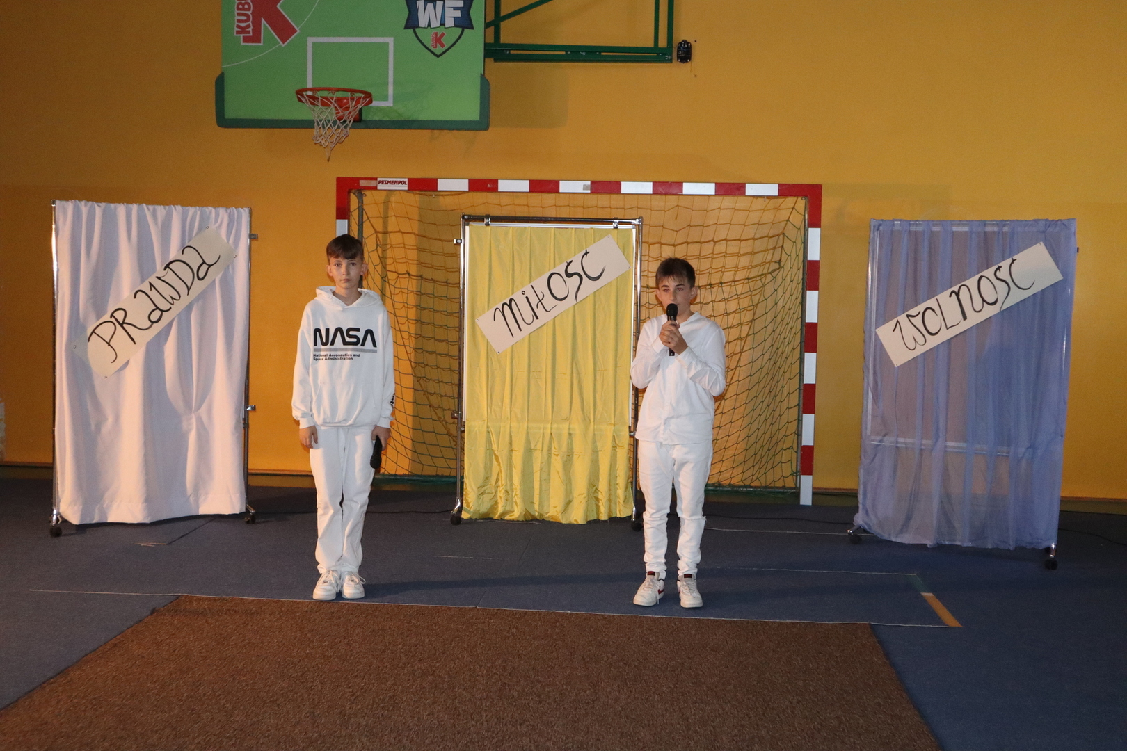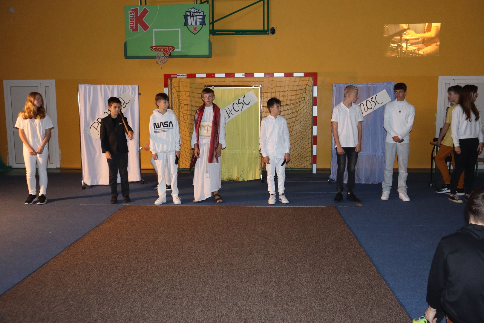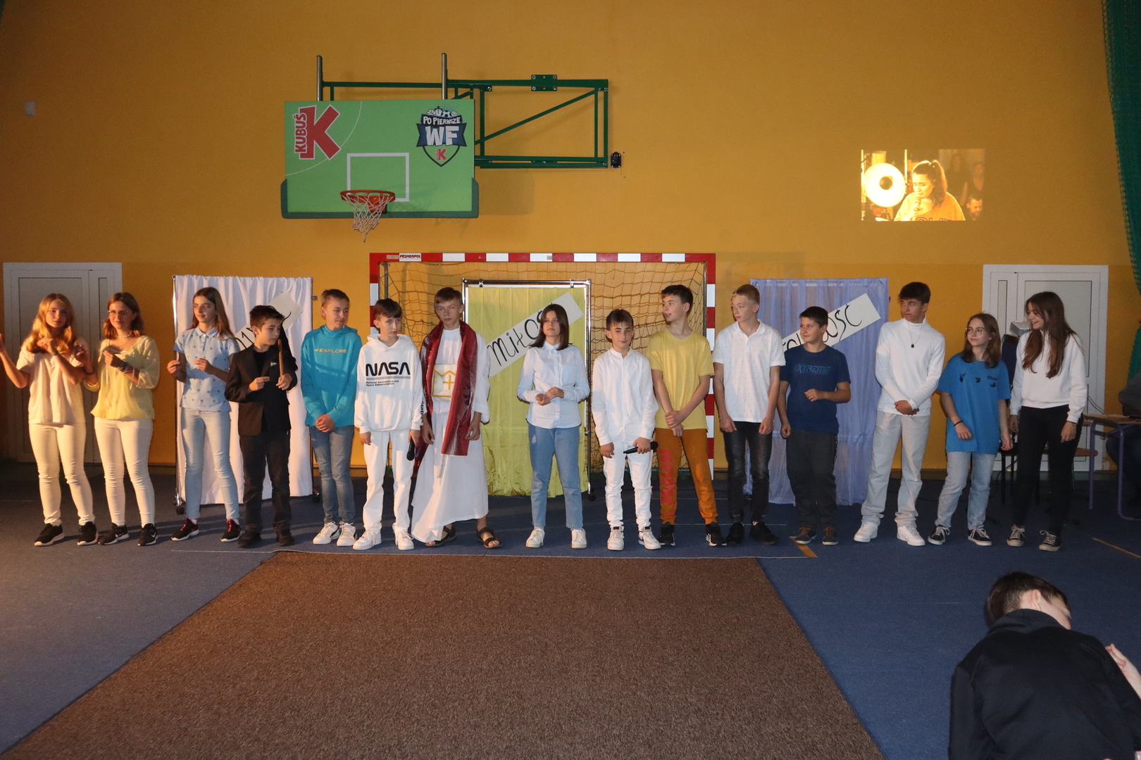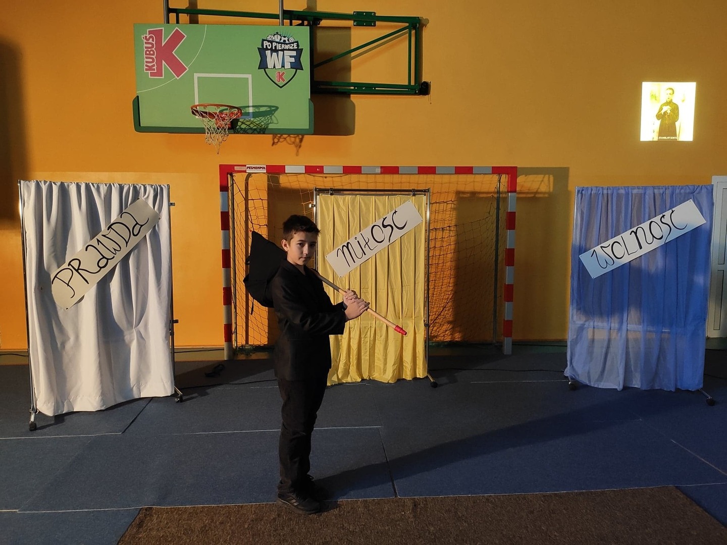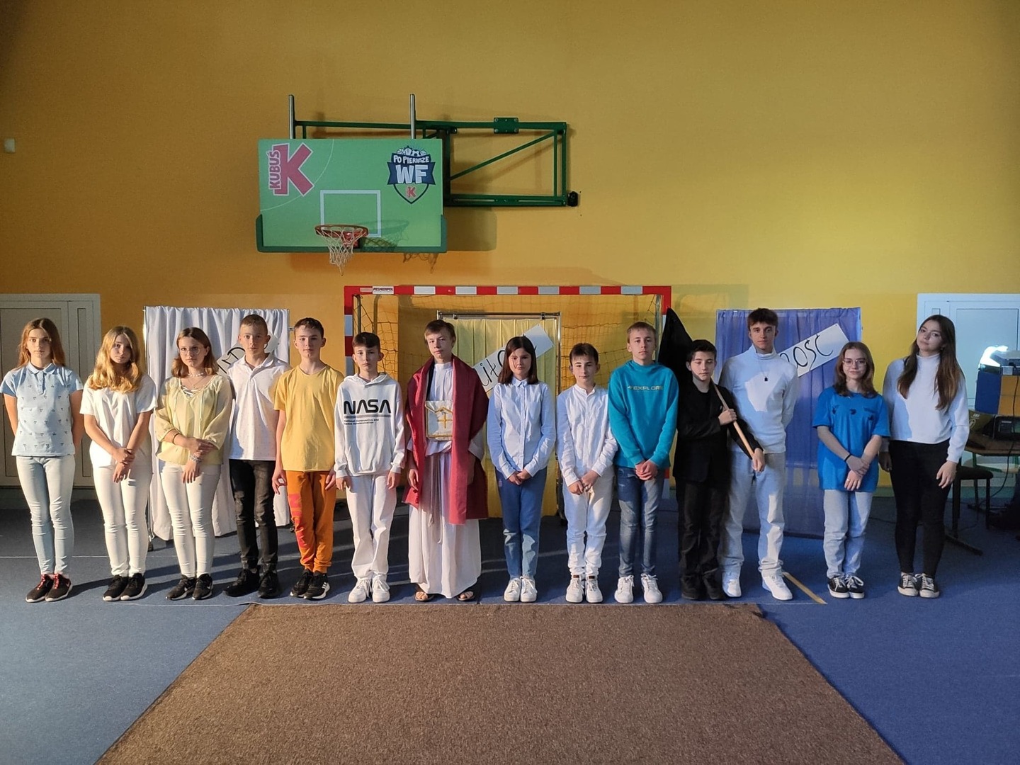 Dnia 17 października 2022 r. w naszej szkole odbył się, jak co roku, apel papieski przygotowany pod okiem p. katechety Zbigniewa Motyla. Wystąpili w nim uczniowie klasy VIII oraz VI. Motywem przewodnim tegorocznych obchodów Dnia papieskiego było hasło: Veritatis splendor czyli „Blask prawdy”. Hasło to jest tytułem jednej z encyklik Papieża Jana Pawła II. Młodzi aktorzy wcielili się w postaci świętych: Stanisława Kostki, Carla Acutisa oraz Tarsycjusza, dzięki którym mogliśmy głębiej zrozumieć podstawowe treści zawarte w papieskim dokumencie. Występ uświetnił śpiew z pokazywaniem pieśni religijnych oraz prezentacja multimedialna.