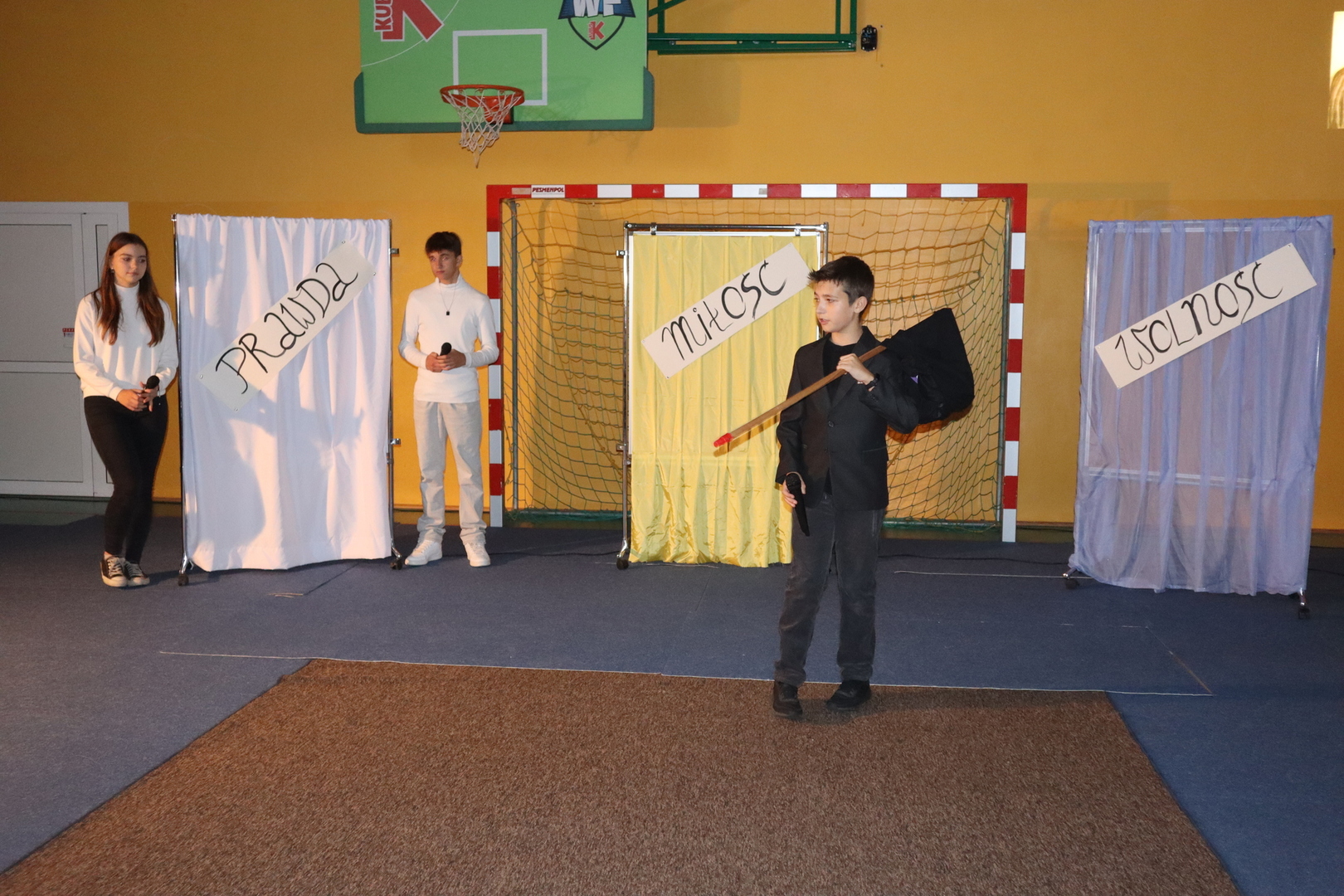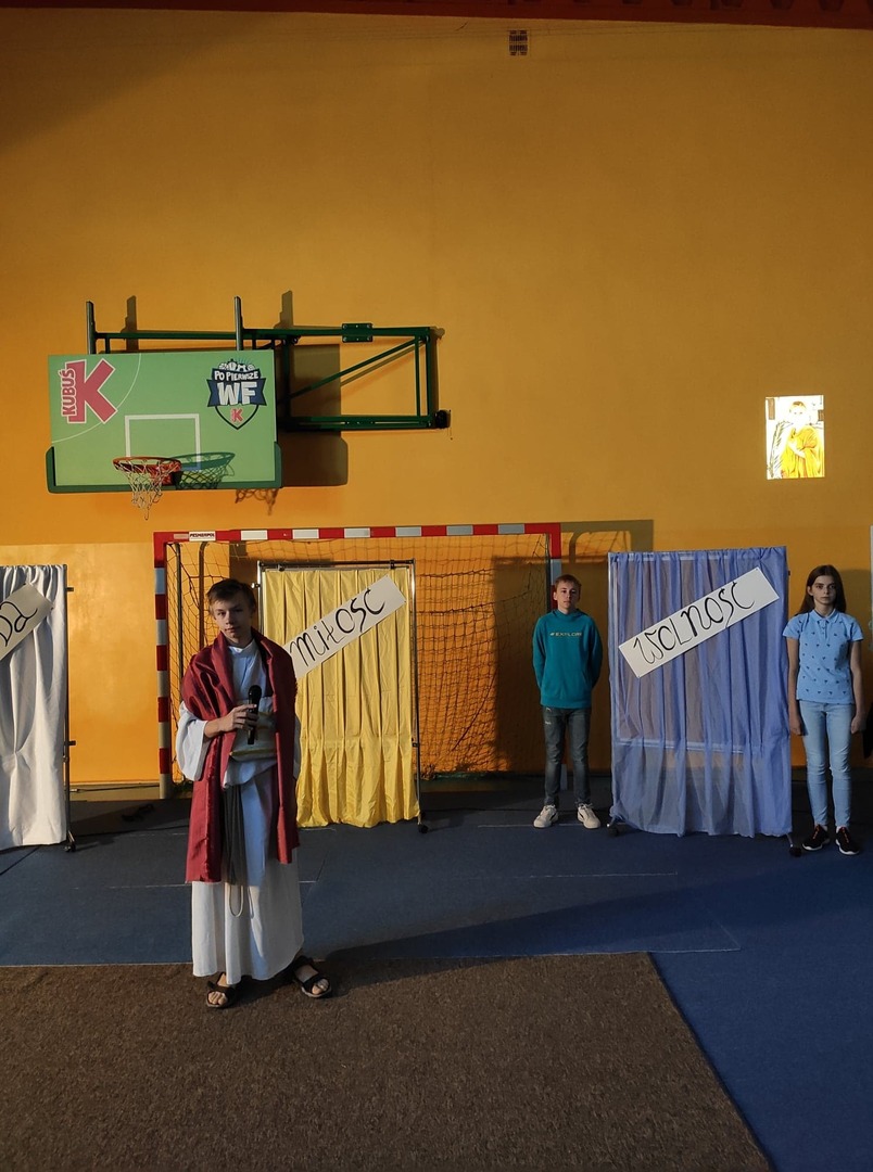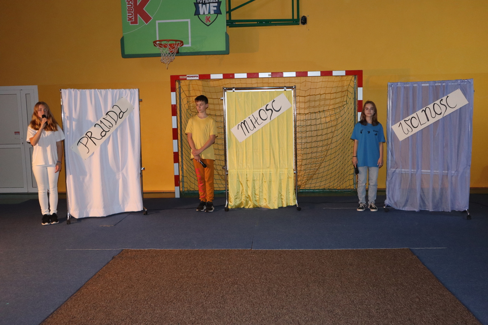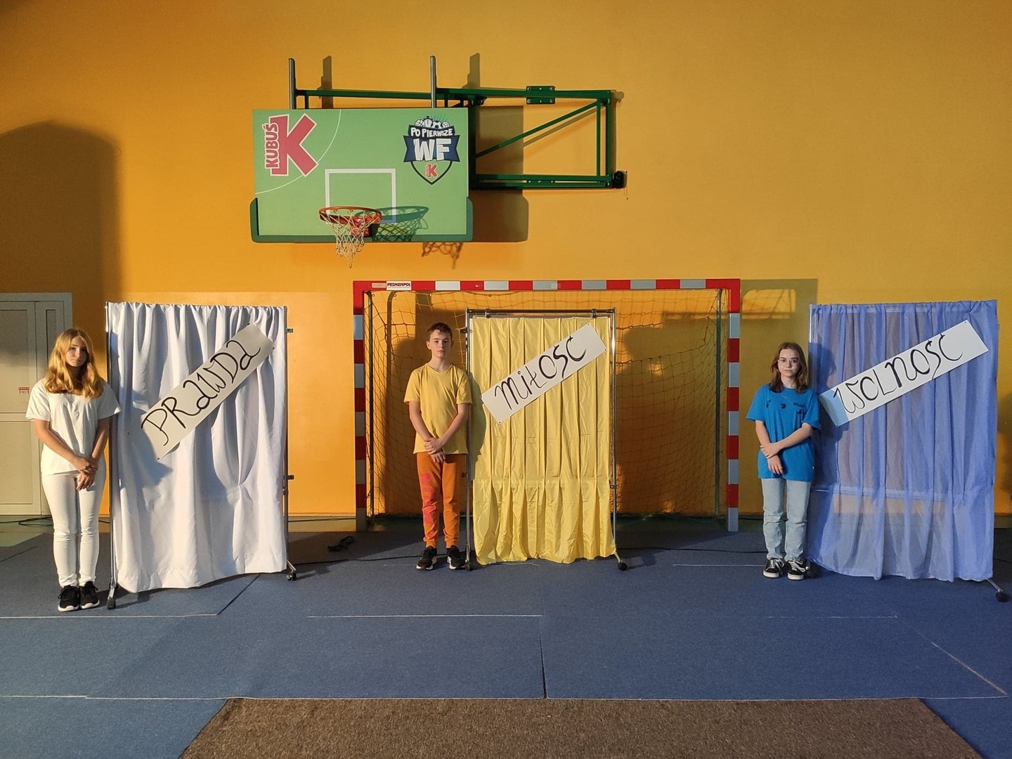 Dnia 17 października 2022 r. w naszej szkole odbył się, jak co roku, apel papieski przygotowany pod okiem p. katechety Zbigniewa Motyla. Wystąpili w nim uczniowie klasy VIII oraz VI. Motywem przewodnim tegorocznych obchodów Dnia papieskiego było hasło: Veritatis splendor czyli „Blask prawdy”. Hasło to jest tytułem jednej z encyklik Papieża Jana Pawła II. Młodzi aktorzy wcielili się w postaci świętych: Stanisława Kostki, Carla Acutisa oraz Tarsycjusza, dzięki którym mogliśmy głębiej zrozumieć podstawowe treści zawarte w papieskim dokumencie. Występ uświetnił śpiew z pokazywaniem pieśni religijnych oraz prezentacja multimedialna.