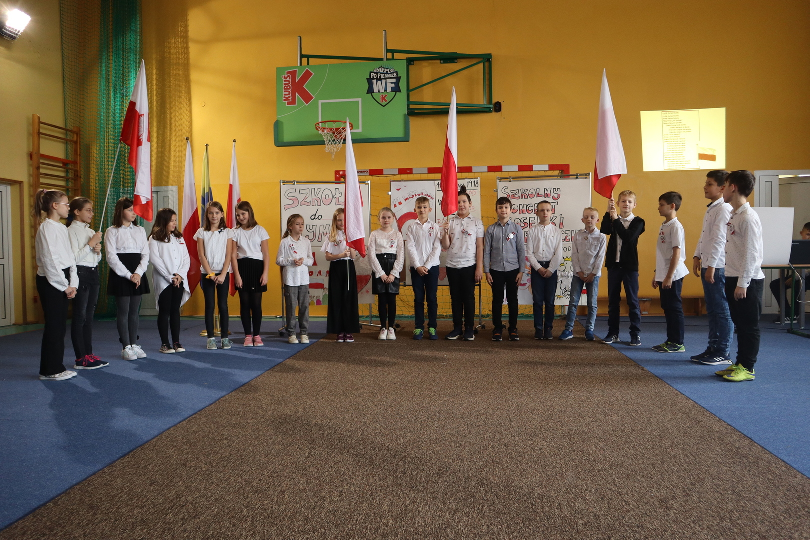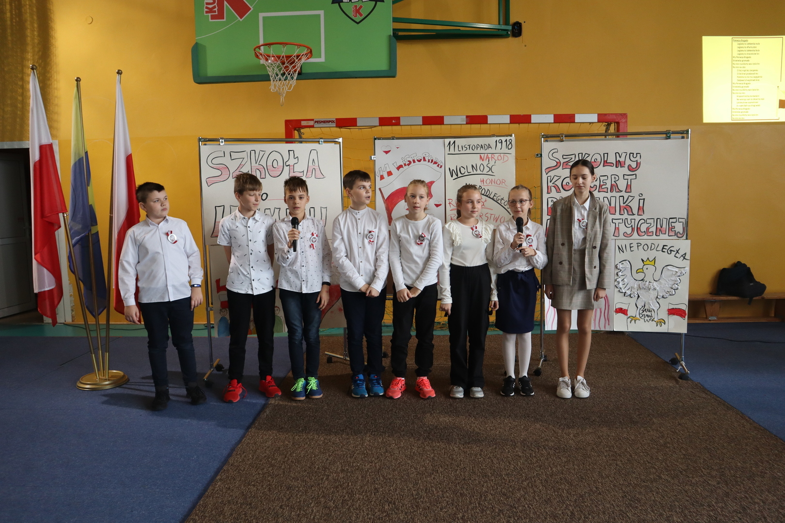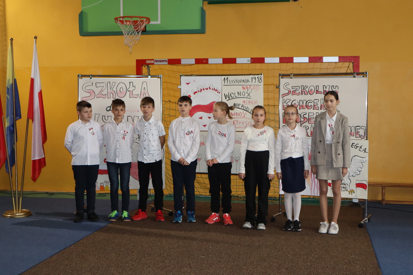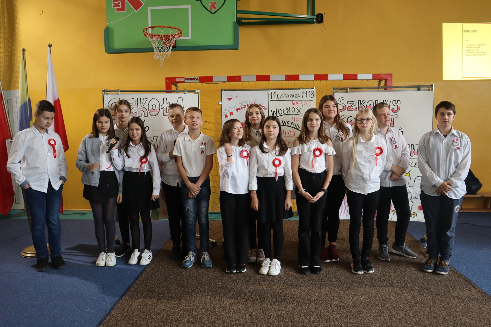 W dniu dzisiejszym (10. 11. 2022) uczniowie naszej szkoły ubrani na galowo i przystrojeni kotylionami wzięli udział w uroczystym apelu z okazji jutrzejszego Dnia Niepodległości. Najpierw obecności pocztu sztandarowego odśpiewany został w całości Hymn Narodowy. Tym samym Szkoła w Bratoszewicach wzięła udział w ogólnopolskiej akcji - "Szkoła do hymnu!". Następnie odbył się Szkolny Koncert Piosenki Patriotycznej. Uczniowie zaśpiewali przygotowane przez siebie najsłynniejsze piosenki patriotyczne. Cała sala udekorowana była plakatami związanymi z dniem - 11 Listopada - przygotowanymi na lekcjach plastyki pod okiem P. Aleksandry Miller. Wszyscy uczesticy koncertu nagrodzeni zostali gromkimi brawami.
