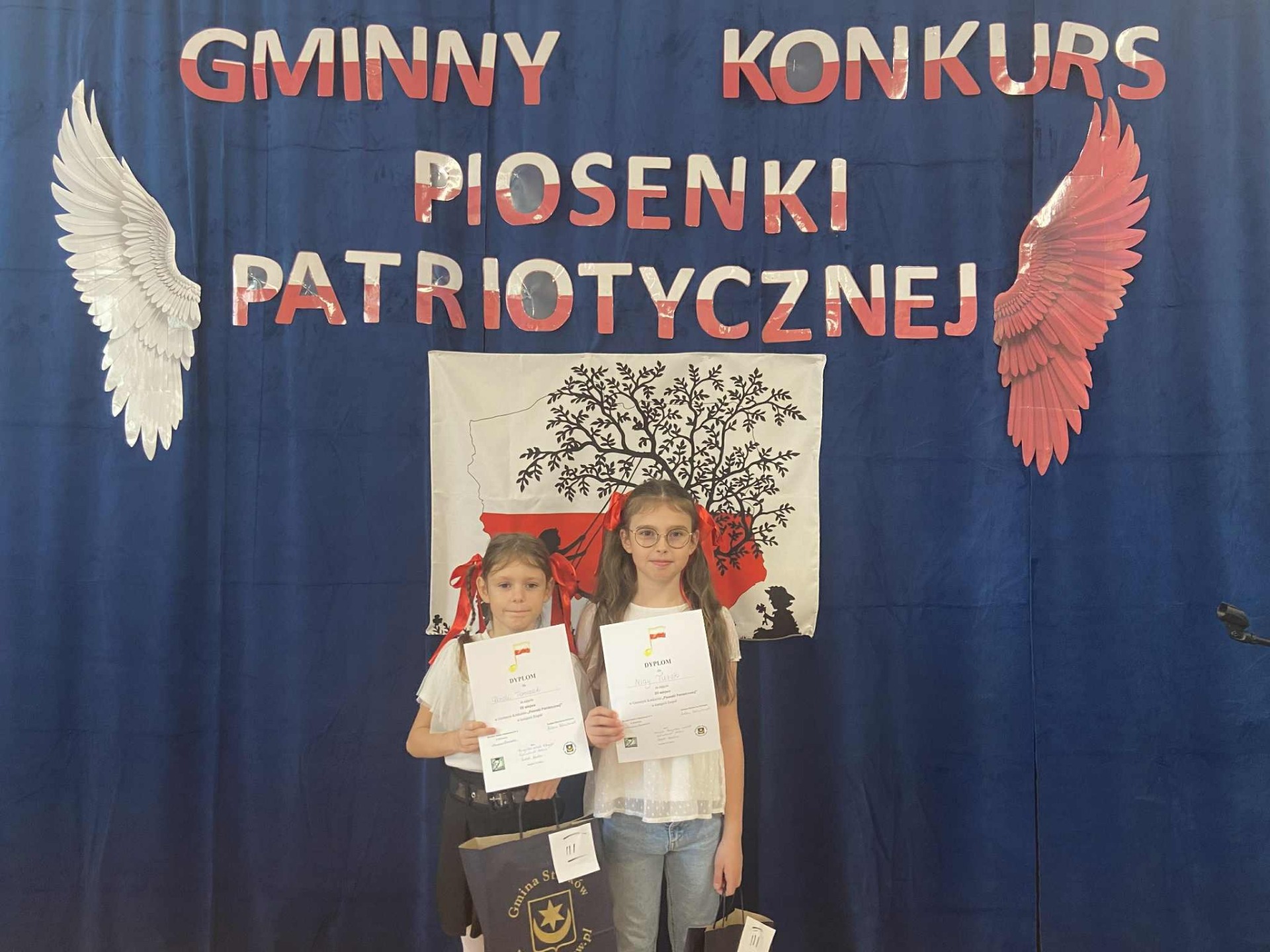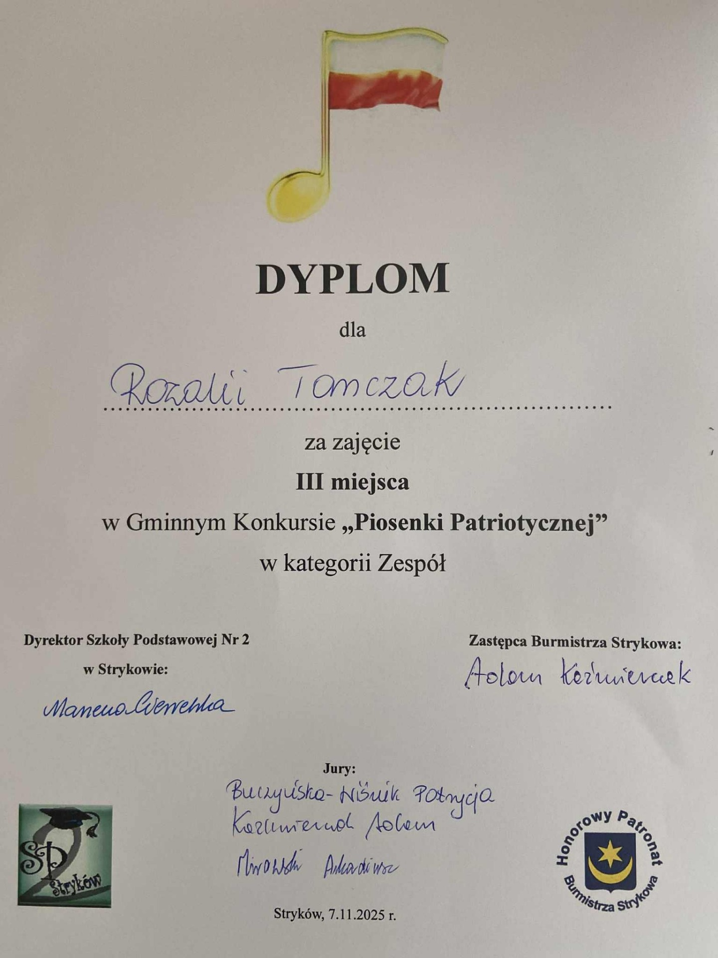W dniu 7 listopada 2025 r. uczennice klasy III Nina Turek i Rozalia Tomczak reprezentowały naszą szkołę w Gminnym Konkursie „Piosenki Patriotycznej" zorganizowanym w Szkole Podstawowej nr 2 w Strykowie.