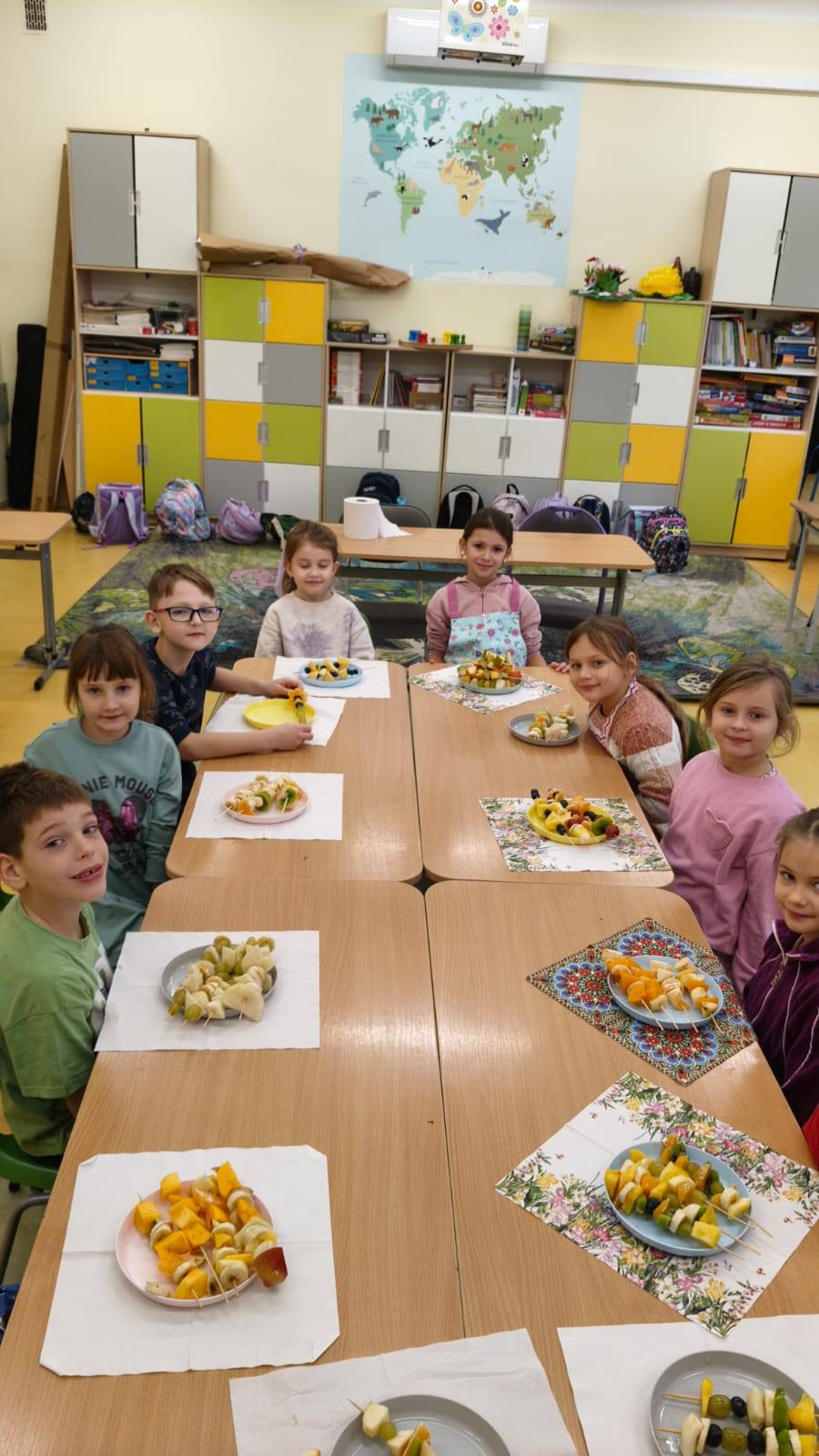 W dniu 17. 11 klasa 1 sprawdzała się dzisiaj w roli małych kucharzy i przygotowała szaszłyki owocowe. Uczniowie świetnie sobie poradzili z tym zadaniem- zadbali o piękne kompozycje, współpracę i porządek. Przygotowanie szaszłyków dało dzieciom wiele satysfakcji i uświadomiło, jak ważną rolę odgrywają witaminy we właściwym funkcjonowaniu organizmu.